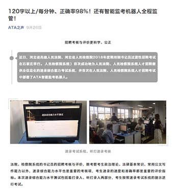 監考機器人已成功服務了多次大規??荚?,服務對象包括“全國稅務師職業資格考試”,“全國專利代理人資格考試”,“銀行專業人員職業資格考試”,“人民檢察院系統人才招聘考試”,以及“ACT(香港考點)”等等,廣受好評。